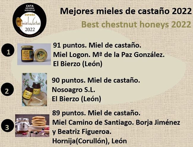 En esta edición, a la que han concurrido 80 mieles de toda la Península, la miel del Bierzo ha destacado dentro de la categoría de las mieles monoflorales de castaño, obteniéndose un triple triunfo. Además de este primer puesto como mejor miel de castaño de España 2022, ha pasado a la final donde han competido las doce mejores mieles valoradas por el jurado obteniendo el tercer puesto como mejor miel de España.