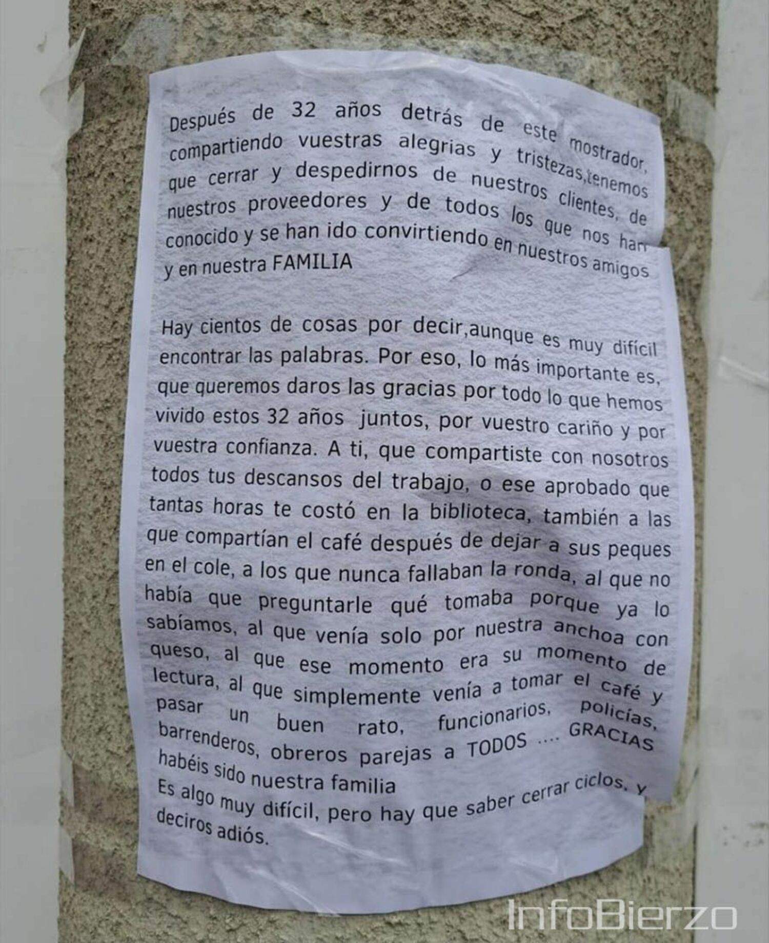 "A ti que compartiste con nosotros tus descansos del trabajo, o ese aprobado que tantas horas te costó en la biblioteca, también a las que compartían el café después de dejar a sus peques en el cole, a los que nunca fallaban la ronda, al que no había que preguntale qué tomaba porque ya lo sabíamos, al que venía solo por nuestra anchoca con queso, al que ese momento era su momento de lectura, al que simplemente venía a tomar el café y pasar un buen rato, funcionarios, policías, barrenderos, obreros, parejas, a todos... Gracias, habéis sido nuestra familia. Es algo muy difícil, pero hay que saber cerrar ciclos y deciros adiós".
