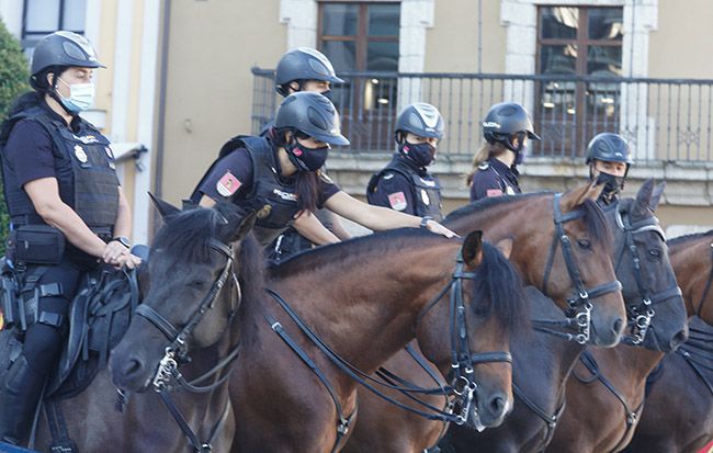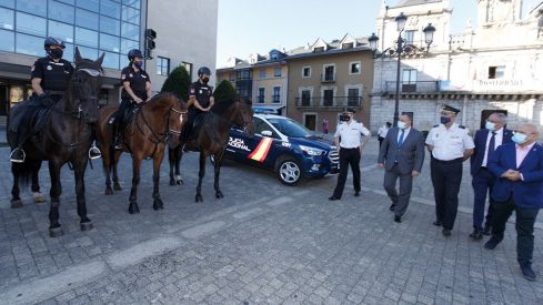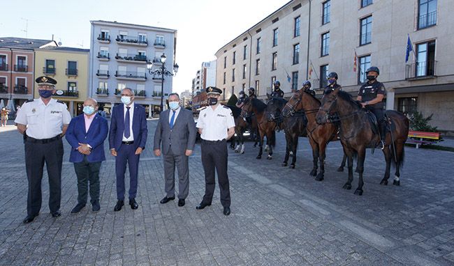 (I a D): El Comisario Jefe Provincial de Operaciones de León, Abelardo Ramos; el subdelegado del Gobierno en León, Faustino Sánchez; el alcalde de Ponferrada, Olegario Ramón; el presidente de la Diputación de León, Eduardo Morán; y el jefe superior de Policía de Castilla y León, Juan José Campesino, durante la presentación de la Unidad de Caballería de la Policía Nacional (Fotos: César Sánchez / ICAL)Media docena de agentes de la Unidad de Caballería de la Policía Nacional patrullarán durante tres fines de semana del mes de agosto los más de 15 kilómetros del Camino de Santiago a su paso por el municipio de Ponferrada. En el acto de presentación de esta unidad, el subdelegado del Gobierno en León, Faustino Sánchez, explicó que la presencia de este equipo llegado de Madrid es fruto del protocolo de colaboración entre la Policía y la Federación Española de Asociaciones de Amigos del Camino y que su principal objetivo es “hacer ver a los peregrinos nacionales y extranjeros que el Camino es seguro y que las instituciones lo protegen”.