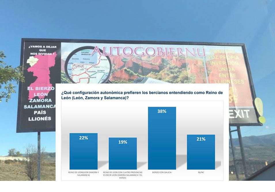 El último apartado de la encuesta, en el que los bercianos podían elegir una hipotética nueva configuración autonómica, la mayoría (38%) preferiría anexionar El Bierzo a Galicia. Un 22% escogió la opción del Reino de León formado por León, Zamora y Salamanca, seguido del 21% que no sabe o no contesta. El resto, un 19% de los encuestados, optarían por un Reino de León con 4 provincias (León, Samora, Salamanca y El Bierzo).