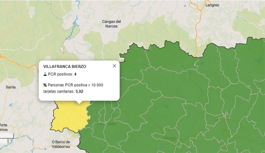 En total, El Bierzo y Laciana acumulan 2.582 casos de COVID-19 registrados desde el inicio de la pandemia. Por zonas básicas, se distribuyen 1.507 casos en Ponferrada (403 en Ponferrada I; 459 en Ponferrada II; 337 en Ponferrada III; 308 POnferrada IV); en Bembibre 500 casos; 145 en Cacabelos; 93 en Villafranca; 89 en Puente de Domingo Flórez; 18 en Toreno; y 137 en Villablino.