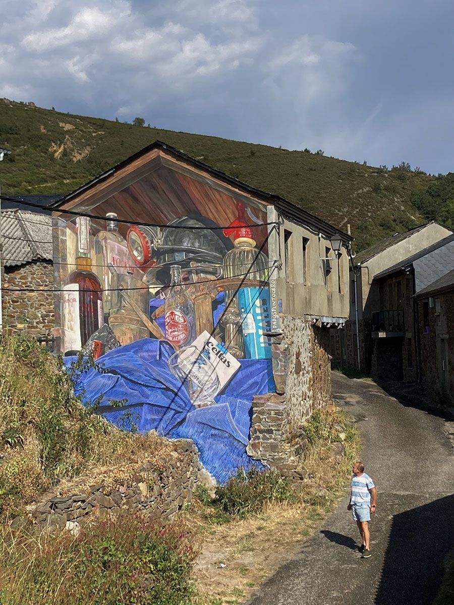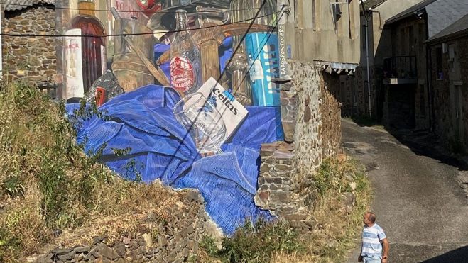 El mural del artista Da 2, combina distintos elementos de la zona como la minería, representada por un casco, con una botella de 'Zumos Pobladura', una gaseosa de Pobladura de las Regueras; una botella de ginebra, una copa de vino, una manta, etc.