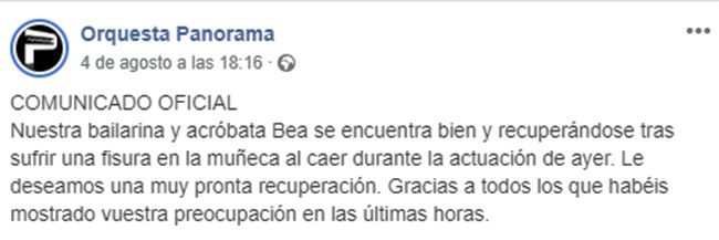 La agrupación explica en sus redes sociales que la acróbata se encuentra bien y tras la caída se fisuró la muñeca y sufrió varias abrasiones, sin embargo, la formación continuó su gira en la provincia de León, en el municipio de Rueda del Almirante.