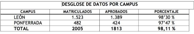 En concreto en el caso de los estudiantes bercianos examinados en el Campus de Ponferrada, de los 482 matriculados, han aprobado 424, lo que supone un 97,47%.