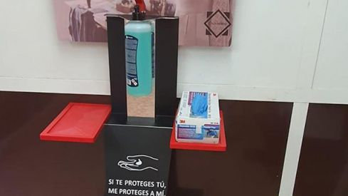Así mismo, el aparato dispone de dos mesas para colocar guantes y mascarillas -otros de los objetos de protección indispensables frente al contagio del Covid19- y dos papeleras para reciclas desechechos. Igualmente, lleva incorporado un cartel para ofrecer publicidad, normativas o lo que requiera el comprador.
