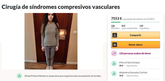 Por ello ha creado un crowdfunding con el objetivo de recaudar dinero y poder así costearse los gastos de una cirugía para tratar los síndromes compresivos vasculares que padece. En España, solo existe un médico especializado en este tipo de patologías, en Málaga y además pertenece a la sanidad privada, por ello da las "gracias a todos y cada uno de los que aportéis vuestro granito de arena para que mi camino sea menos duro”.