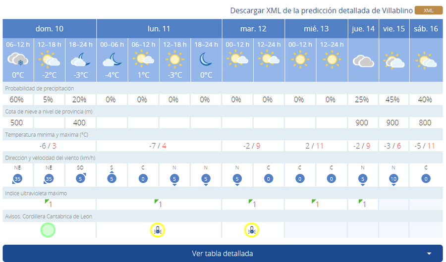 El termómetro en Villablino mantendrá este domingo los -6 grados de mínima y tan solo subirán hasta los 3 positivos. Más frío notarán el lunes, cuando la mínima baja hasta los -7 y la máxima será de 4 grados positivos. Aunque aún por debajo de cero, el martes la jornada dejará una máxima algo más elevada, 9 grados, y -2 de mínima. El miércoles será el único día que el termómetro no baje del cero, con 2 positivos de mínima y 11 de máxima. El frío vuelve el jueves, cuando la mínima volverá a ser negativa, -2, y la máxima baja hasta los 9 grados.