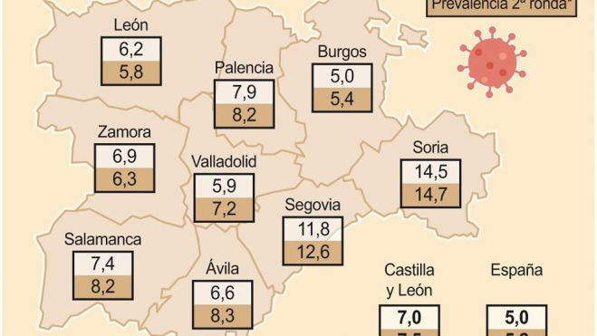 Asimismo, la tercera provincia con el porcentaje de inmunidad más elevado es Ávila, con un 8,3 por ciento, frente al 6,6 por ciento del primer estudio. Le siguen a poca distancia Palencia con una prevalencia de la infección del 8,2 por ciento, frente la 5,9 por ciento registrado en la primera fase, junto con Salamanca, en el que el porcentaje ha subido desde el 7,4 por ciento al 8,2 por ciento.