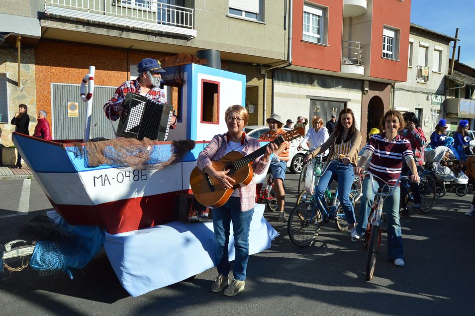 Una veintena de grupos participaron este domingo en el desfile de Camponaraya, siguiendo el ritmo por la calles de la localidad en un recorrido que finalizó en el pabellón con una gran chocolatada. Hasta esta localidad berciana llegó 'La Dorada', el simbólico barco de la serie 'Verano Azul', con Chanquete, Julia, Pancho, Piraña, Bea, Javi, Desi y Quique, junto a otra fantasía llegada desde las profundidades del mar, con sirena incluida.