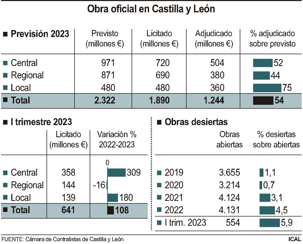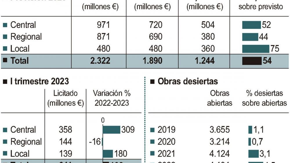 En 2022, el presidente de la Cámara de Contratistas, señaló que se licitaron 4.131 obras, de las que el 4,58% se quedaron desiertas, con un importe de 56 millones de euros. En lo que va de año, de enero a marzo de las 554 proyectos, el 5,96 por ciento se han quedado abandonadas, si bien sus previsiones indican que este porcentaje crecerá al ocho por ciento de las 4.400 previstas, lo que supondría que se quedarían en el cajón 352 obras. Esto, señaló, se debe a que el sector no ha recuperado las pérdidas por los sobrecostes de las materias primas por el Real Decreto, ya retirado por el Gobierno, que consideró “farragoso”.