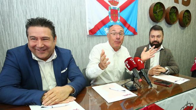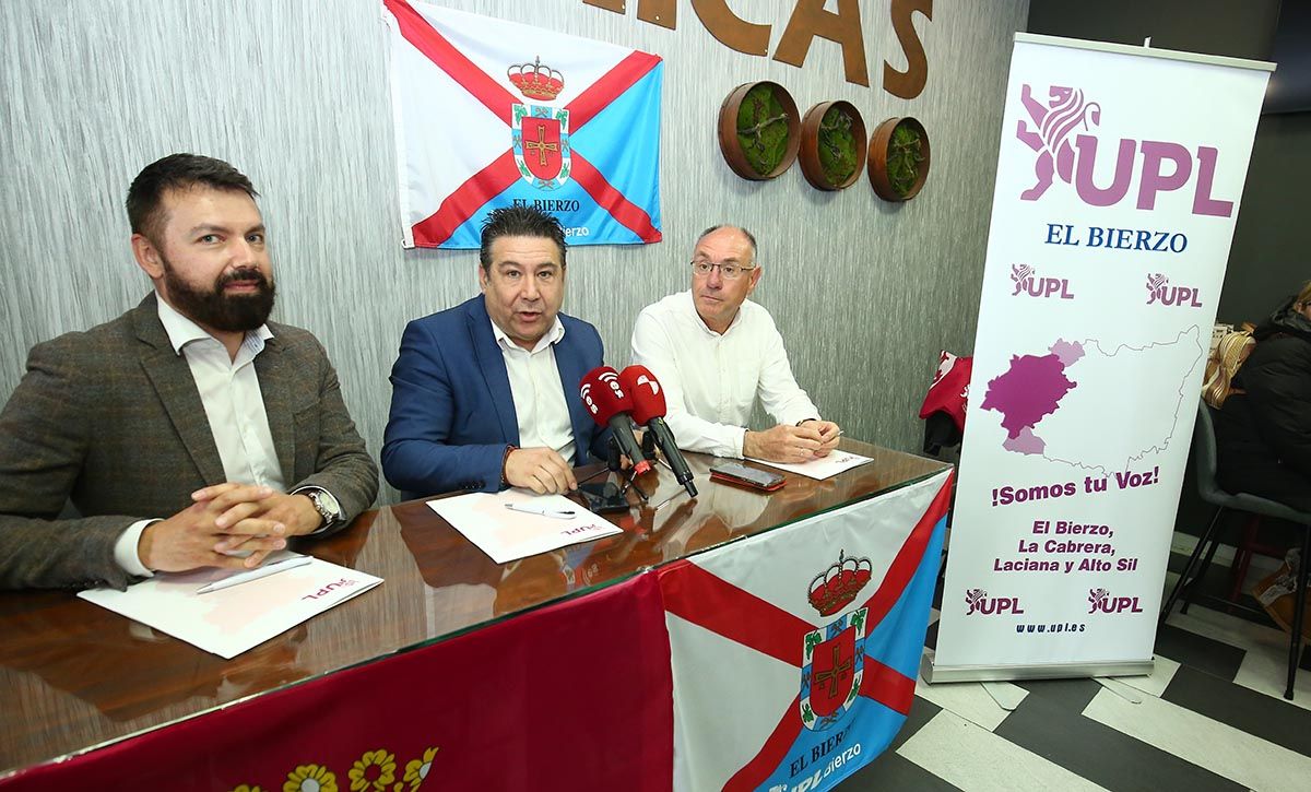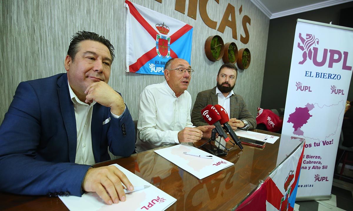 El secretario general de UPL, Luis Mariano Santos (I), junto al secretario comarcal de UPL-Bierzo, José Ramón García (D), presentan al candidato de los leonesistas a la alcaldía de Bembibre (León), Sigifredo Benavides (C)La línea programática pone las miradas en el trabajo y la promoción del polígono: “Bembibre, el Bierzo y, por ende, León, necesitan trabajo”, y puso como ejemplo el polígono que “hace diez años tenía 50 empresas y ahora quedan 20”.