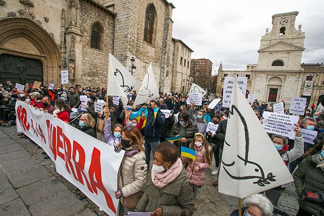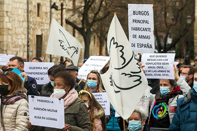 Más de medio millar de personas clamaron en Burgos contra la guerra de Rusia y Ucrania bajo el lema ‘No a la guerra’, en una movilización en la céntrica calle San Lesmes, que “desbordó” las expectativas previstas y obligó a los participantes a trasladarse a la cercana plaza de San Juan, con varios agentes de la policía local regulando el tráfico.