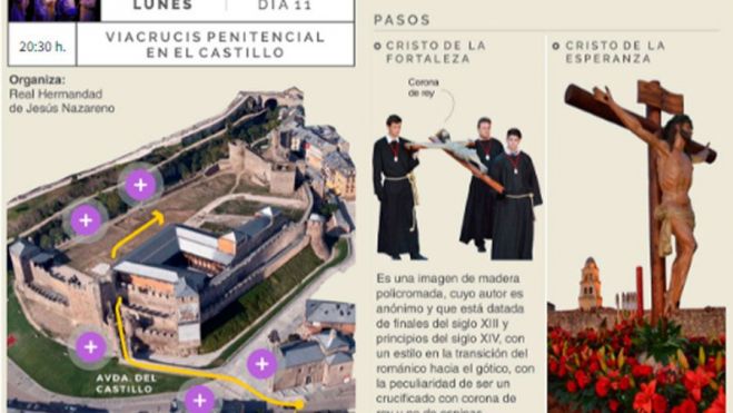 Los cofrades portan el paso del Cristo de la Fortaleza, réplica de la antigua imagen que albergaba la capilla del Castillo, desde la iglesia de San Andrés. Después tiene lugar el solemne rezo de las estaciones del Via Crucis en el Patio de Armas de la fortaleza. Tras el rezo, los pasos del Cristo de la Fortaleza y del Cristo de la Esperanza celebran su encuentro.