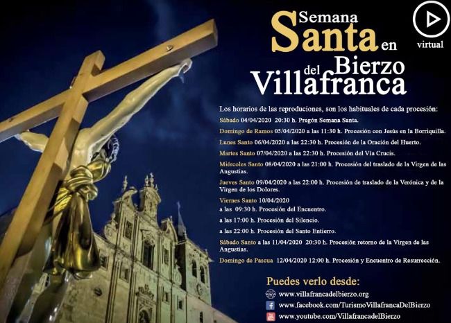 El tradicional pregón de Semana Santa tendrá lugar este sábado 4 de abril a las 20.30 horas y se retransmitirá de forma virtual a través de la página web y redes sociales del Ayuntamiento de Villafranca del Bierzo. Las imágenes de todos los actos de Semana Santa se retransmitirá a través de estas plataforma hasta el Domingo de Pascua.