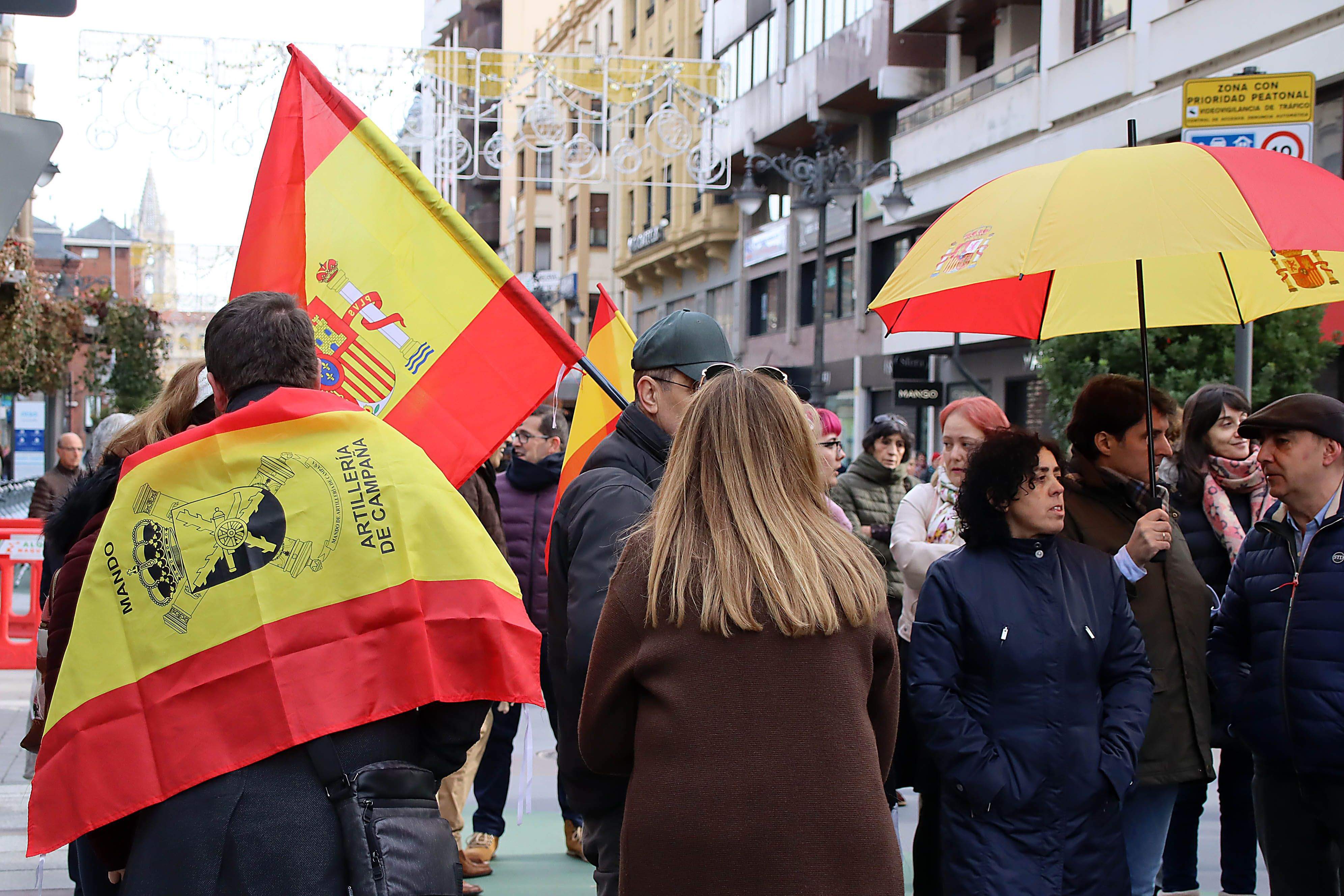 Numerosas banderas de España acompañaron una concentración que se desarrolló sin incidentes, en el mismo escenario que en otras ocasiones, y a la que asistieron entre 300 y 400 personas, según fuentes oficiales, y que concluyó con el himno nacional.