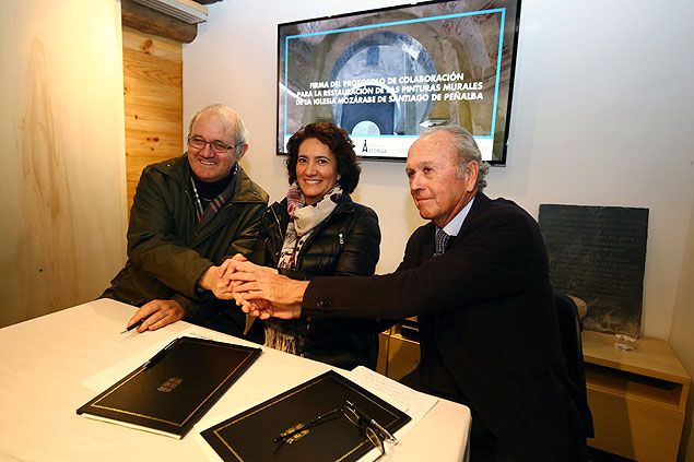 La consejera de Cultura y Turismo, María Josefa García Cirac, firmó hoy el protocolo de colaboración con la asociación World Monuments Fund (WMF) y con el Obispado de Astorga, que permitirá llevar a cabo la restauración y conservación de las pinturas murales mozárabes de la iglesia de Santiago de Peñalba, en la localidad ponferradina de Peñalba de Santiago. El importe total de esta fase supera los 331.000 euros, de los cuales WMF aportará 100.000 y el resto irá a cargo del Ejecutivo autonómico. García Cirac confió en que, una vez terminados los trabajos, la iglesia de Peñalba consituya un “revulsivo para el impulso al desarrollo de la zona”.
