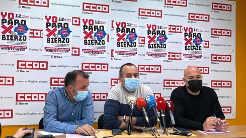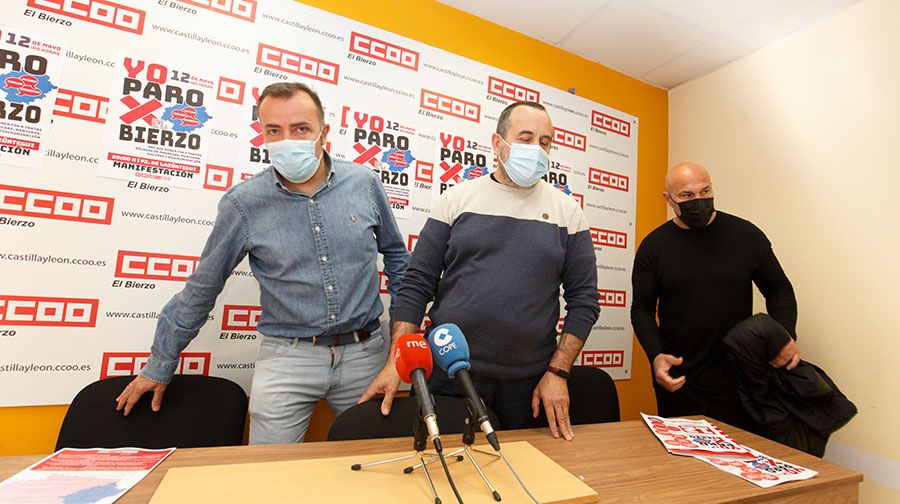 Fotografía ICAL / Los secretarios comarcalew de UGT, Omar Rodríguez (I), CCOO, Ursicinio Sánchez (C), y USO, Gabriel Garnelo (D), durante la presentación de los actos de reivindicación del 12 de mayo, bajo el eslogan ‘Yo paro por El Bierzo’