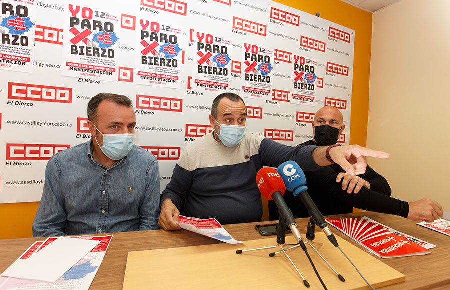 Fotografía ICAL / Los secretarios comarcales de UGT, Omar Rodríguez (I), CCOO, Ursicinio Sánchez (C), y USO, Gabriel Garnelo (D), durante la presentación de los actos de reivindicación del 12 de mayo, bajo el eslogan ‘Yo paro por El Bierzo’Los responsables de los sindicatos CCOO, UGT y USO en la comarca del Bierzo presentaron este martes las movilizaciones que tendrán lugar el próximo 12 de mayo bajo el eslogan ‘Yo paro por El Bierzo’. Paros de una hora con concentraciones ante los centros de trabajo, por la mañana, y una manifestación con salida en la plaza de Lazúrtegui, a última hora de la tarde, son los principales actos de una protesta con la que las organizaciones sindicales pretenden revertir la “situación agónica” de la economía berciana.