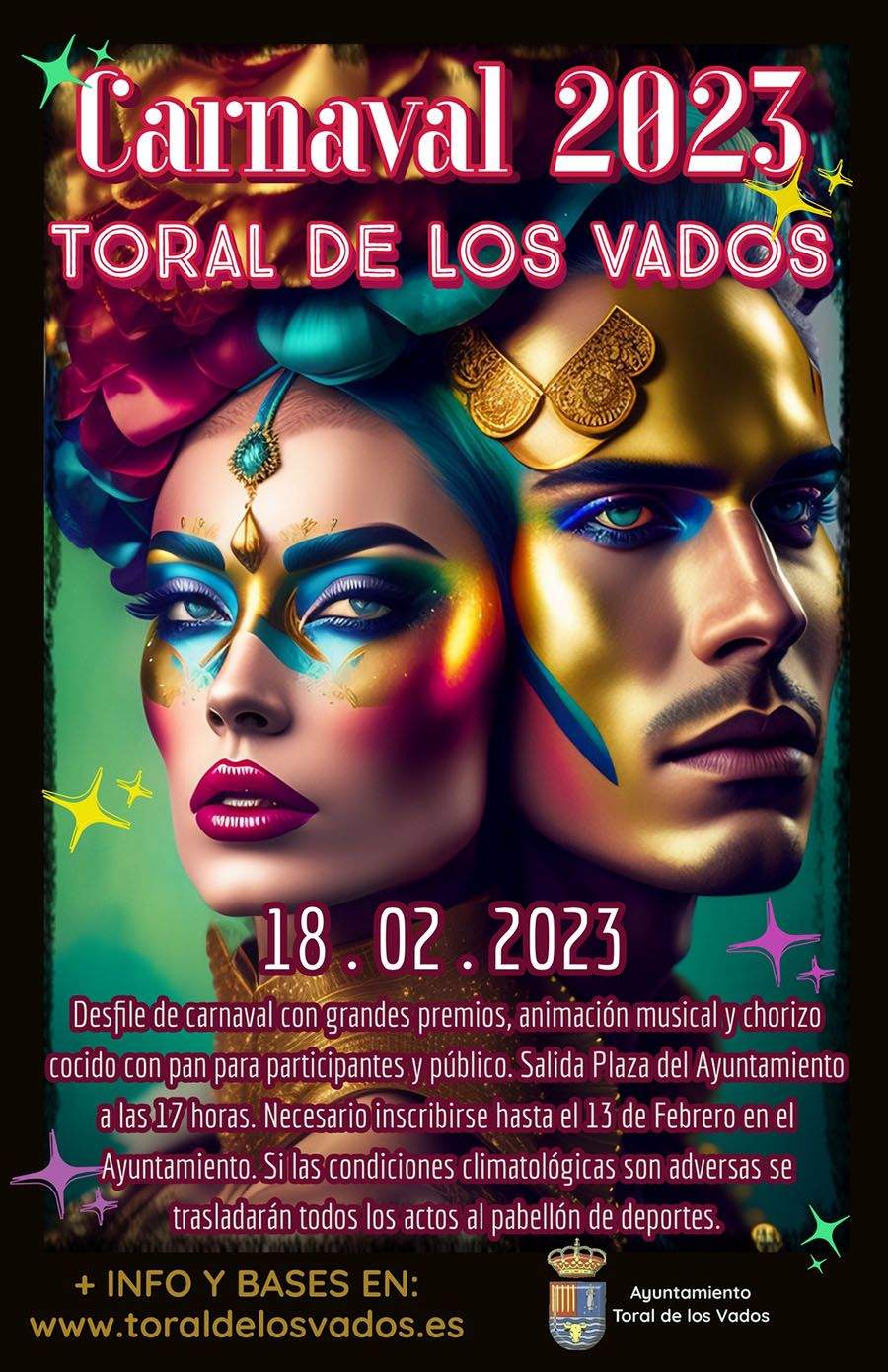 Podrán participar en el desfile de Carnaval y cobrar su premio, todas las personas o grupos que se inscriban y recojan su dorsal en las oficinas del Ayuntamiento de Toral de los Vados hasta el 13 de febrero de 2023. Si alguna persona o grupo, no se inscribe antes de esa fecha, no podrá reclamar la cuantía asignada por participar en el desfile.