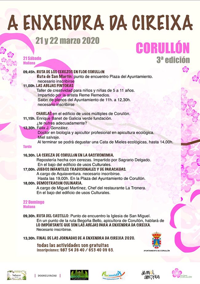 Corullón celebrará la tercera edición de sus ya tradicionales jornadas "A enxendra da cireixa", haciendo un alarde del mayor espectáculo de floración en El Bierzo. El sábado 21 y domingo 22 de marzo, Corullón rendirá homenaje a la floración de sus cerezos, una seña de identidad del municipio. A tal efecto, han organizado un amplio programa cultural integrado por rutas de senderismo, talleres de cestería y cocina, charlas, actividades para los más pequeños y muchas otras sorpresas para los amentes de la primavera.