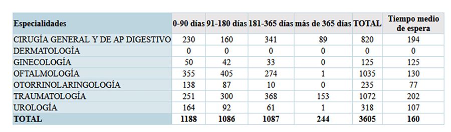 En estos términos, 1.188 personas han tenido que esperar hasta 90 días, 1.086 entre 91 y 180 días, 1.087 pacientes esperaron entre 181 y 365 días y 244 más de un año. Es decir, un total de 1.331 pacientes han esperado entre medio año y un año para operarse.