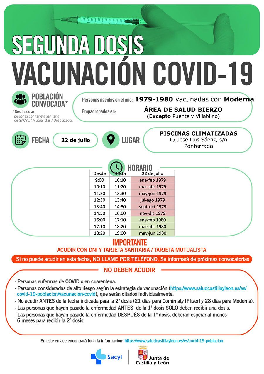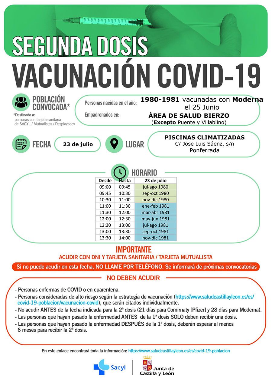 Recordamos que este jueves se están inoculando las segundas dosis de quienes se vacunaron hasta el 8 de mayo de AstraZeneca. Asimismo, el viernes, 16 de julio, se pondrán la segunda dosis los vacunados con Pfizer el 25 de junio de 1980 y 1981. Y finalmente, los nacidos entre 1979 y 1981 recibirán su segunda dosis de Moderna el 22 y 23 de julio.