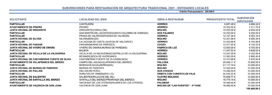 Hórreos en Balboa, Besande, Cantajeira, Castañeiras-Fuente de Oliva, La Laguna de Castilla, Prada de Valdeón y Prioro; una palloza en Campo del Agua; chozos en Fasgar y Pallide; pajares en San Martín del Agostedo; un palomar en Valdesaz de los Oteros, o una fábrica de luz en Vivero de Omaña, serán objeto este año de estas ayudas de la institución provincial para su recuperación, así como un buen número de molinos en Dragonte, Morgovejo, Murias de Paredes, Salientes, Santalla del Bierzo, Silván, Valencia de Don Juan y Velilla de la Valduerna.
