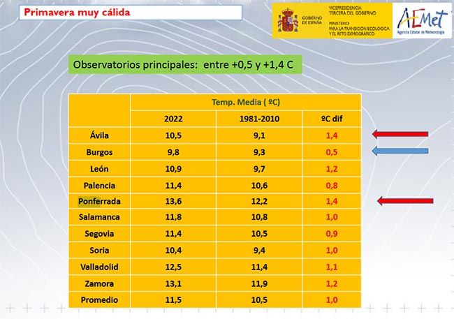 Según señaló Barcones, la primavera en Castilla y León tuvo un balance “cálido o muy cálido”, con una temperatura media de 10,5 grados centígrados, lo que supone 0,7 grados por encima de la media, situándose como la decimoquinta primavera más cálida desde 1951, igualada con la de 2021. Con ello, destacó el frío de abril, que llegó a registrar temperaturas mínimas en Segovia de menos 5,6 grados centígrados y un espesor de nieve de ocho centímetros en la semana más fría a principios del mes.
