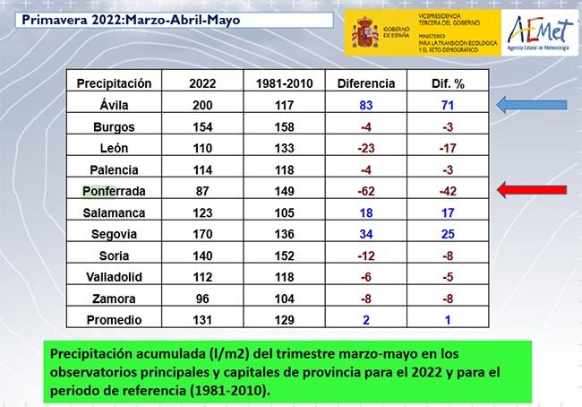 Por su parte, la otra referencia meteorológica de extracción de datos, la AEMET, recoge que en Ponferrada las precipitaciones acumuladas han sido de 87 l/m² frente a las 149 de media recogidas entre 1981 y 2010, lo que supone una diferencia de 62 l/m² y una diferencia porcentual de 42 puntos.