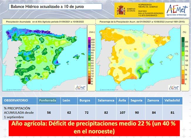 El balance hídrico, actualizado el pasado mes de junio, señaló que el año agrícola en la comunidad recogió un déficit de precipitaciones medio del 22 por ciento, siendo un 40 por ciento en el noroeste. Asimismo, a pesar del carácter lluvioso de marzo y abril, las lluvias “no fueron suficientes” en España para paliar esta situación de sequía con la que terminó el invierno. Así, a mediados de junio de 2022, llovió un 24 por ciento menos a nivel nacional desde el pasado 1 de octubre.