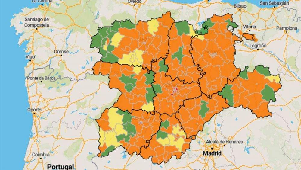 En el mapa de Castilla y León, domina el color naranja: restringir al máximo el contacto social, evitar reuniones de más de diez personas y limitar al máximo la exposición en lugares cerrados. En otras 16 zonas el color es el amarillo: extremar las medidas de precaución y prevención y no realizar desplazamientos innecesarios.