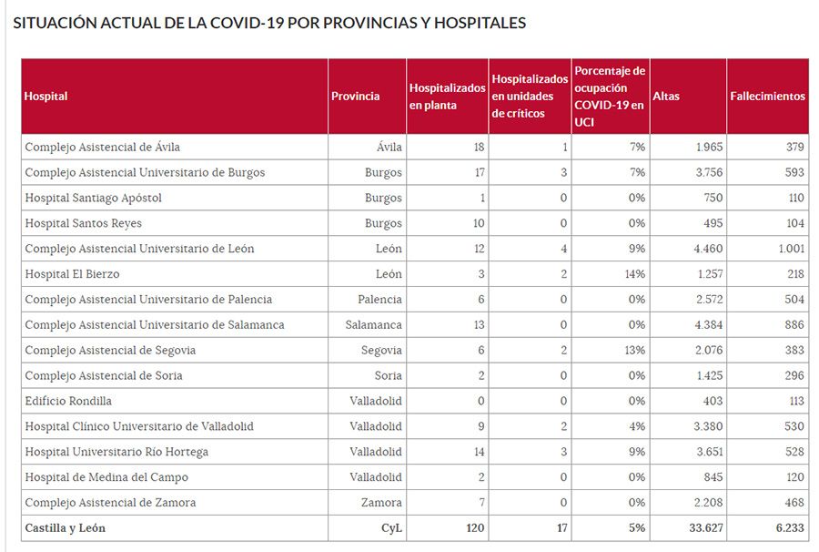 Con respecto a las altas, no se han emitido nuevas durante la jornada de este miércoles. Al respecto, tampoco hay que lamentar nuevos decesos desde el día 5 septiembre, cuando se produjo el último deceso en el Hospital del Bierzo.