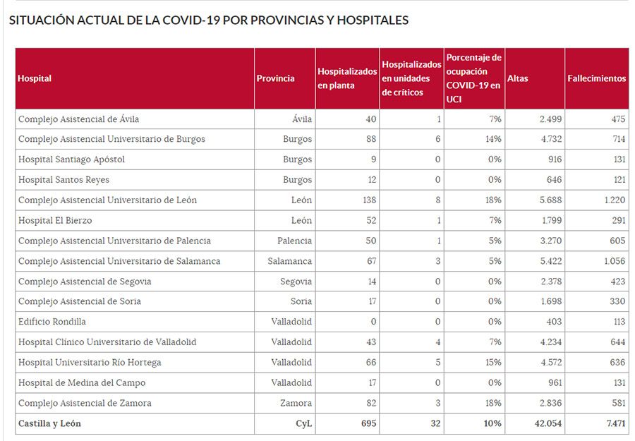 El Hospital del Bierzo ha lamentado, desde el viernes (fecha del anterior informe), 6 nuevos fallecidos (291 desde el inicio de la pandemia), según los datos emitidos por la Consejería de Sanidad de la Junta de Castilla y León. Por otro lado, el complejo hospitalario berciano mantiene un total de 53 pacientes por COVID en sus instalaciones, 52 ellos en planta y 1 en UCI, al 7% de su ocupación. Con respecto a los ingresos, el Hospital del Bierzo ha registrado un total de 22 desde el viernes.