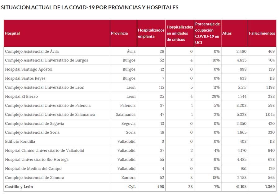 Por su parte, la ocupación de camas por pacientes con COVID-19 en planta se sitúa en el conjunto de la Comunidad en el 8,25 % (riesgo medio). Por encima se encuentran Zamora (14,36 %) y León (11,05 %, en riesgo alto, mientras que Segovia, con el 4 %, continúa en riesgo bajo. El resto de las provincias se encuentran en riesgo medio con Palencia a la cabeza con un 8,58 %, seguida de Valladolid (7,31%), Ávila (7,22 %), Burgos (7,16%), Salamanca (6,58 %) y Soria (5,84 %).