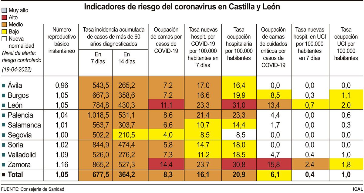 La incidencia más elevada a 14 días en el colectivo mayor de 60 años se registró en la provincia de Palencia, que alcanzó los 1.018 casos, seguida de Zamora, con 865; Soria, con 844, y León, con 784. La mejor situación corresponde a Segovia, con 502 casos, por delante de Valladolid (525), Ávila (543), Salamanca (563) y Burgos (667). Todas la provincias se encuentran en riesgo medio.