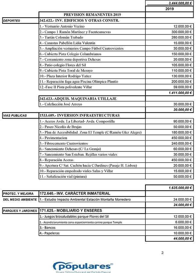 Roberto Mendo (I) y Marco Morala, durante la presentación de la propuesta de obras para destinar los Remanentes 2019 / Mario de la TorreEl Grupo Municipal Popular de Ponferrada ha presentado una propuesta de 41 obras a las que destinar los 3,4 millones de euros de remanentes de 2019, entre las que destaca una partida de más de 1 millón de euros para actuaciones de pavimentación y reparación de aceras. En concreto, 900.000 serán para estas dos acciones -"cuyos lugares concretarían los servicios técnicos en base a la necesidad"- pero también han incluido en la lista las aceras de las avenidas La Libertad y Compostilla (90.000€) o la reparación del empedrado de los viales de Salas y Villar de los Barrios por 15.000 euros.