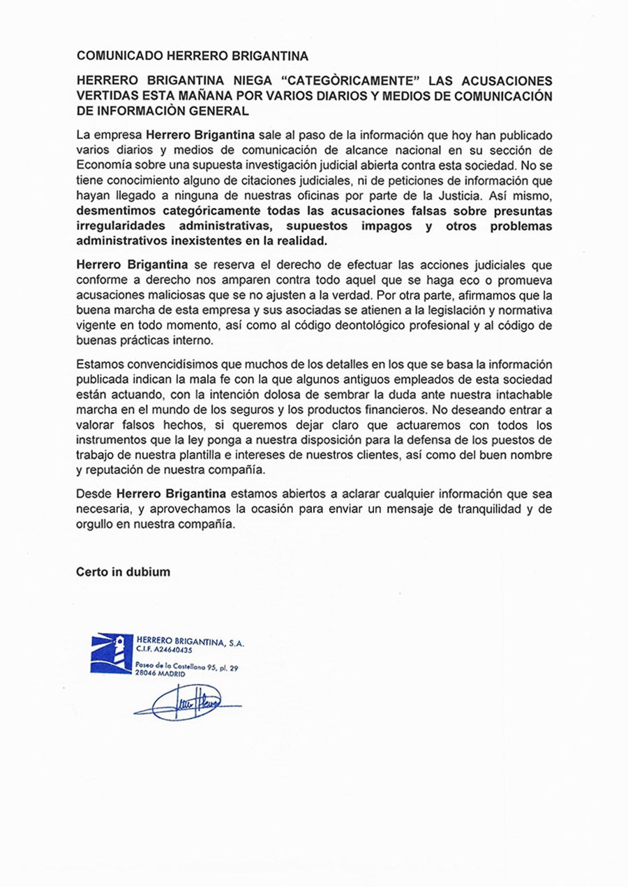 Herrero Brigantina ha hecho público un comunicado en el que niega "categóricamente" las acusaciones vertidas por varios diarios y medios de comunicación sobre una presunta estafa que "rondaría 40 millones de euros": "La cara oculta del milagro financiero de Herrero Brigantina".