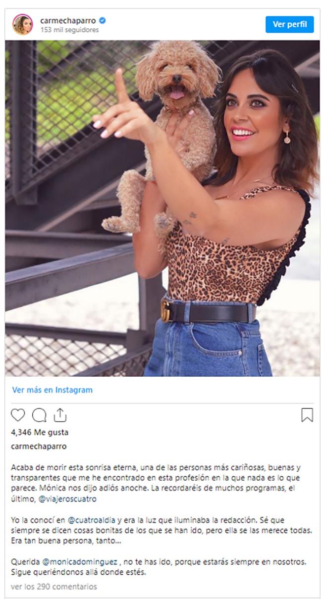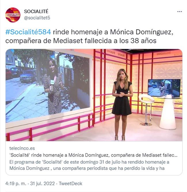 Mónica, incansable viajera, estaba muy unida a sus raíces bercianas, tanto es así que en las pasadas fiestas del barrio Flores del Sil acudió como pregonera. Se la ha podido ver en trabajos televisivos como en Callejeros Cuatro, con 15 años de experiencia en Mediaset, tanto como reportera, como redactora.
