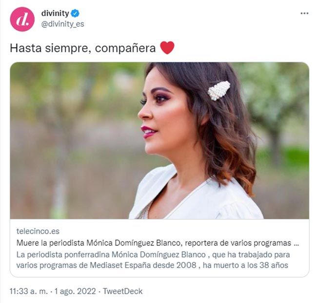 La joven periodista ponferradina Mónica Domínguez falleció durante la madrugada del domingo a los 38 años. La capilla ardiente estará en el Nuevo Tanatorio La Encina y su funeral y entierro será este lunes 1 de agosto a las 12 del mediodía en la Iglesia Parroquial del Buen Pastor de La Rosaleda.