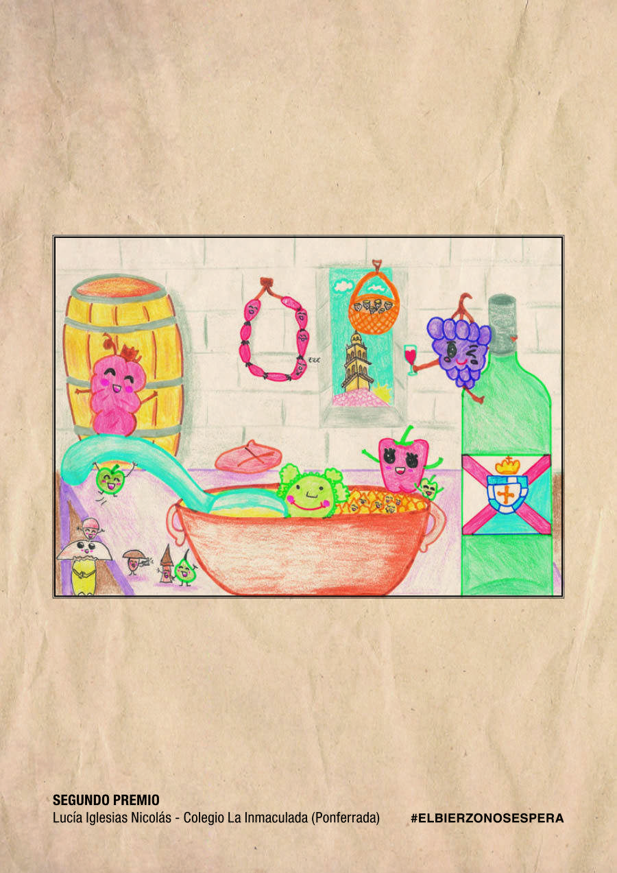El cartel de este año es especial, pues se trata del dibujo ganador del concurso de dibujo infantil organizado por el Consejo Comarcal del Bierzo durante el confinamiento. La pequeña Ruth López González, ya ex-alumna del CRA Valle del Boeza en La Ribera de Folgoso, fue la artista cuya pintura mayor puntuación recibió por parte del jurado en el concurso #ElBierzonosespera, por su originalidad y creatividad, y porque en él figuran todas las figuras de calidad del Bierzo. El segundo premio recayó en Lucía Iglesias Nicolás, alumna de 6º de Primaria en el colegio ponferradino La Inmaculada y el tercero fue para Tristán Pérez Requejo, alumno del CRA La Abadía en Villadepalos.