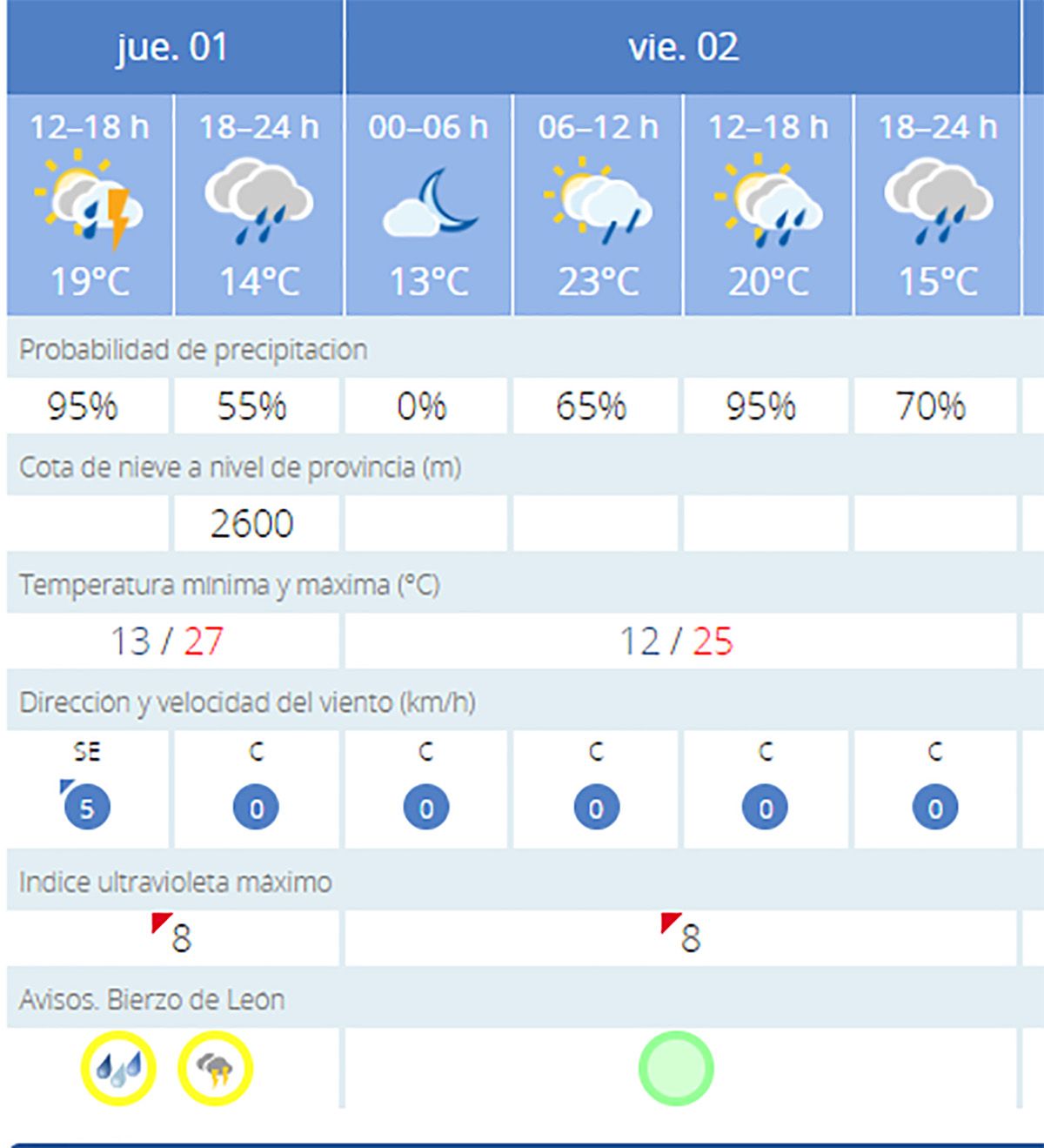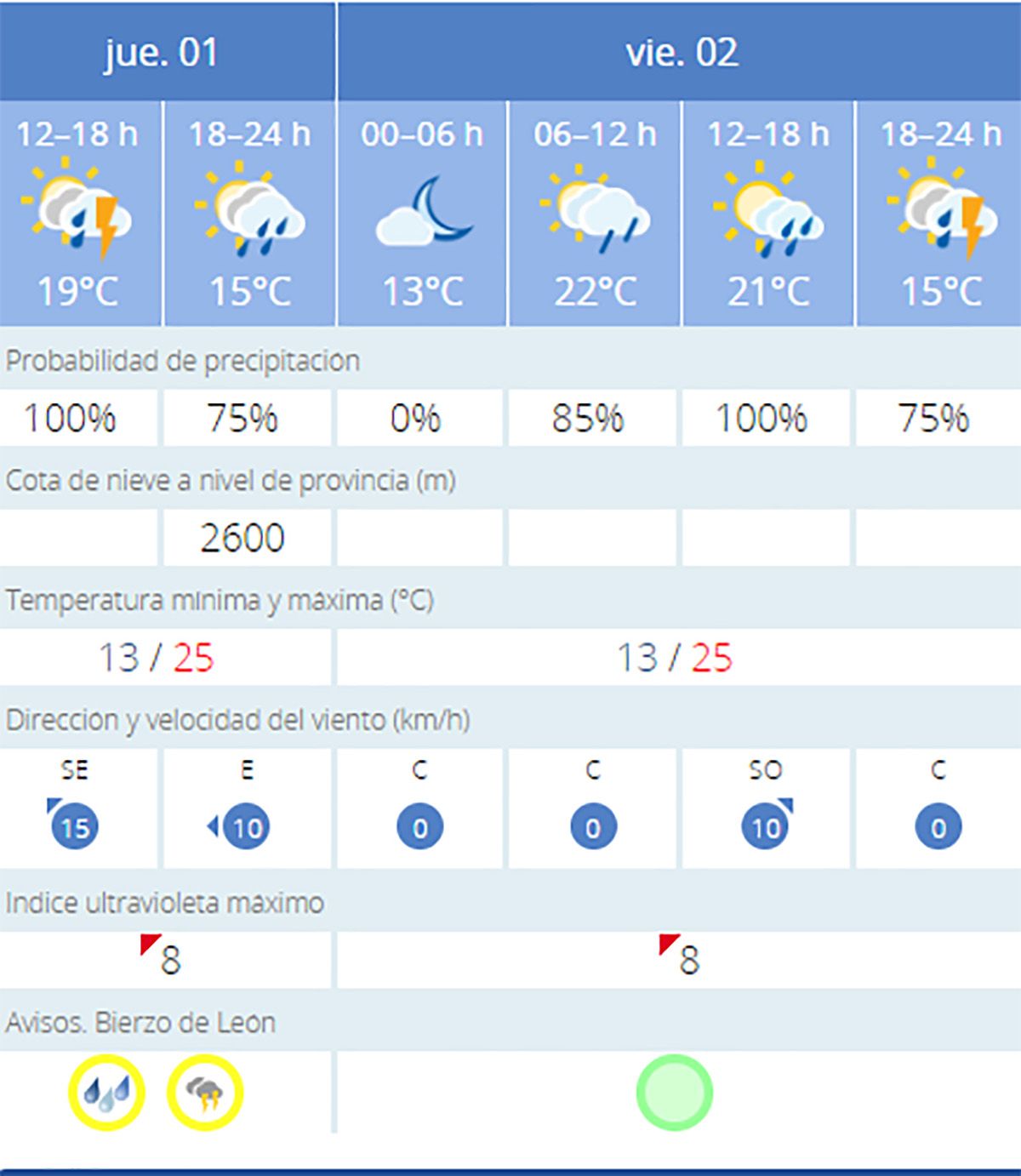 En Ponferrada se espera 100% de probabilidad de lluvia y tormentas desde el mediodía hasta la tarde. Se mantendrá por tanto el aviso amarillo durante toda la jornada del jueves. Las temperaturas rondarán los 13 de mínima y 25 de máxima. Para el viernes pese a no estar activo el aviso amarillo se esperan lluvias durante la mayor parte de la jornada.
