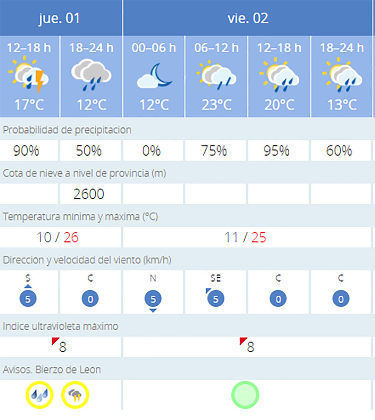 En Fabero la situación será similar a la de la capital berciana, el aviso amarillo por tormentas y lluvia permanecerá a lo largo del jueves acompañado de temperaturas entre los 10 y 26 grados. La jornada del viernes no se mantendrá la alerta, pese a que también existe posibilidad de tormentas.