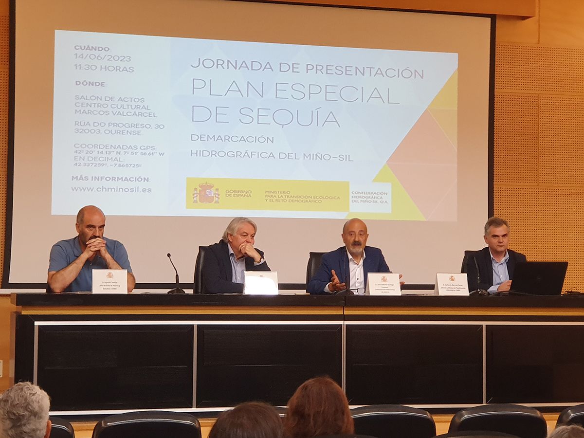 José Antonio Quiroga, presidente de la Confederación Hidrográfica del Miño-Sil (CHMS), organismo autónomo dependiente del Ministerio para la Transición Ecológica y el Reto Demográfico, y Emilio González, subdelegado del Gobierno en Ourense, han inaugurado este miércoles la jornada técnica de presentación del nuevo Plan Especial de Sequía de la demarcación hidrográfica, que se encuentra en período de audiencia e información pública hasta el día 30 de junio.