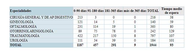 En cuanto a las especialidades, traumatología se mantiene como la que presenta la lista de espera más elevada, con 9.584 pacientes; cirugía general y de aparato digestivo, con 5.207; oftalmología con 4.656; urología, con 2.575, y otorrinolaringología, con 2.428. Los mayores incrementos se dieron en cirugía plástica, con una subida del 54,32 por ciento; cirugía pediátrica (51,52 por ciento) y traumatología (50,60 por ciento). La demora media más alta se registró en cirugía plástica y traumatología, con 125 días, seguidas de neurocirugía, con 116 días y cirugía pediátrica, con 100.
