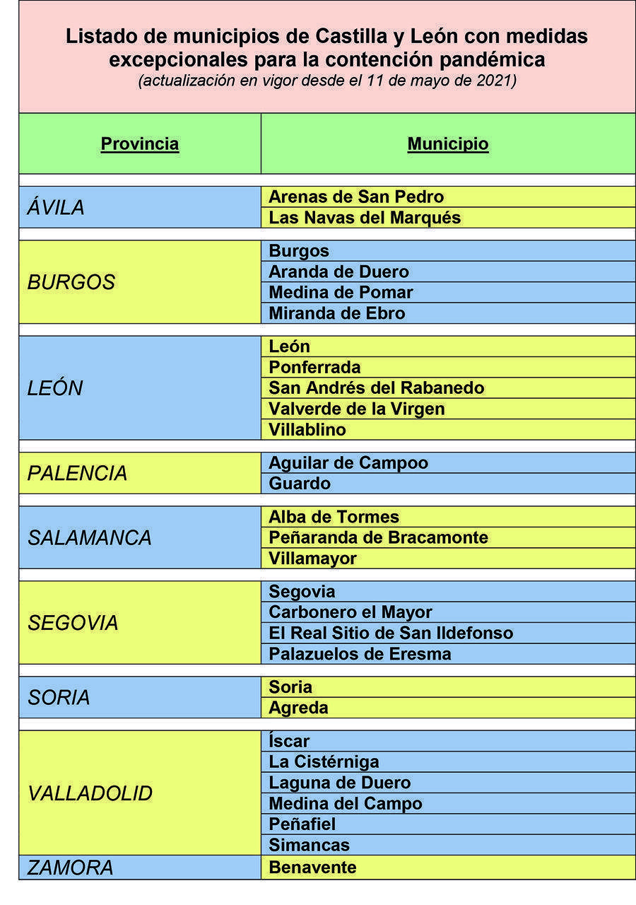 Además de este régimen, agravado en estos 29 municipios, al igual que en el resto de la Comunidad, se mantienen las medidas preventivas ordinarias correspondientes al nivel 4 de alerta sanitaria por la pandemia en Castilla y León, recogidas en el Acuerdo 46/2021, de 6 de mayo, de la Junta de Castilla y León, por el que se actualizan los niveles de alerta sanitaria y el plan de medidas de prevención y control para hacer frente a la crisis sanitaria ocasionada por la COVID-19 en la Comunidad.
