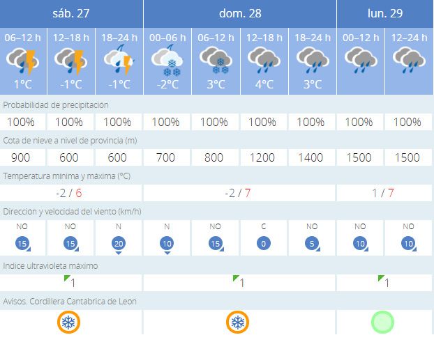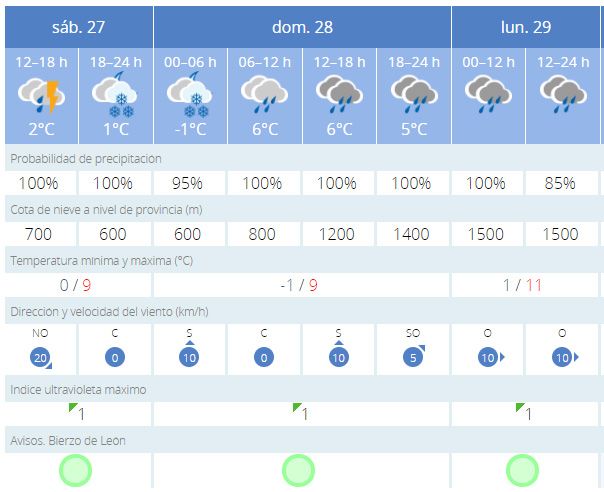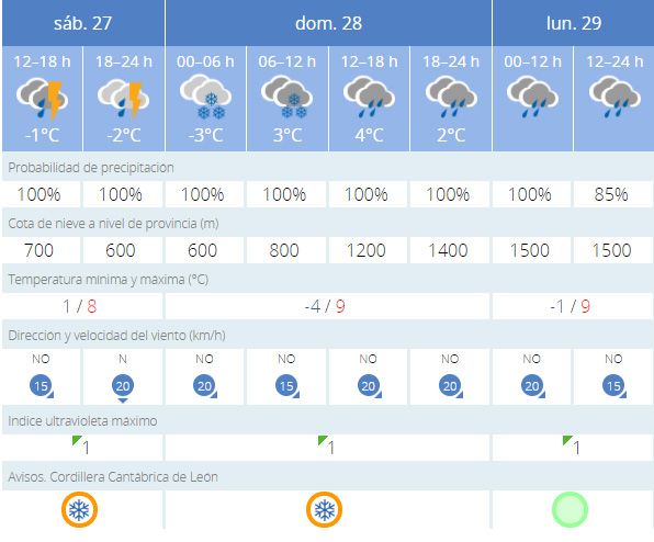 En la capital lacianiega en Villablino, se mantiene al aviso naranja por nieve hasta el lunes, con mínimas que bajarán a -4 grados el domingo y máximas que no superarán los 9ºC. La cota de nieve se mantendrá en 600 metros aunque subirá el lunes a 800 y 1200.