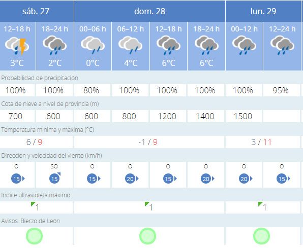 PERANZANESEn El Bierzo Alto, en situación de alerta naranja decretada por la AEMET hasta la madrugada del lunes. En los municipios de Igüeña y Torre del Bierzo nevará sobre los 600 metros, con cota en ascenso para el lunes ya sobre 1.200. Las mínimas, en -2 y máximas de 7 en el mejor de los casos en este punto del Bierzo. Nevará pero con menor incidencia, en Noceda y en Bembibre, donde las mínimas se estancarán en los 0 grados.