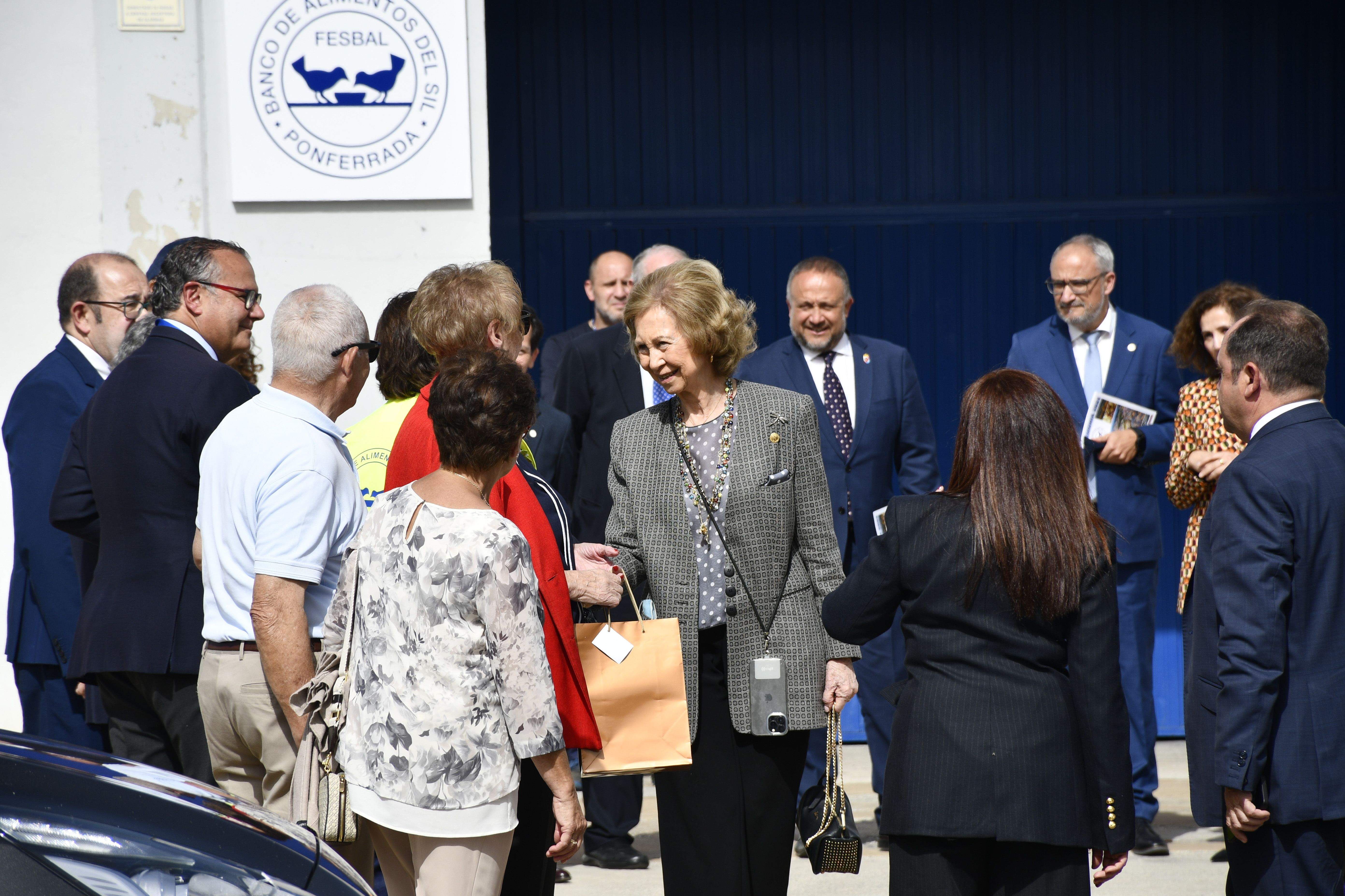 La reina Sofía visitó hoy las instalaciones del Banco de Alimentos del Sil (BAS) en Ponferrada y comprometió el apoyo de la Fundación que lleva su nombre para que la entidad disponga en próximas fechas de una furgoneta con plataforma elevadora para llevar a cabo el reparto entre las familias beneficiarias. Más de un centenar de personas se agolparon en los alrededores del estadio municipal El Toralín para recibir a la monarca con calurosos vítores, gesto que doña Sofía devolvió con un afectuoso saludo.