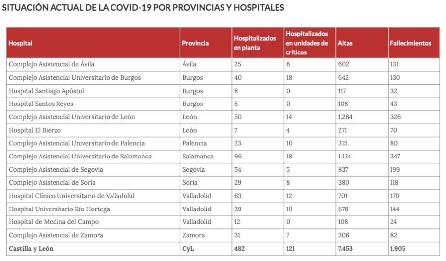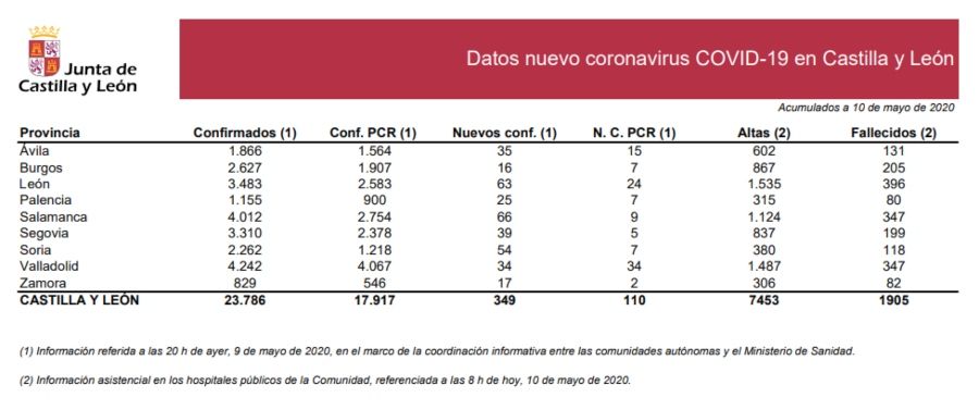 A nivel autonómico, Castilla y León declara hoy la cifra de 23.786 casos confirmados de COVID-19, con un incremento de 349 contagios respecto al sábado. Las altas llegan hoy al total de 7.453 y la cifra de fallecidos a causa de Coronavirus en la Comunidad ascienden al total de 1.905.