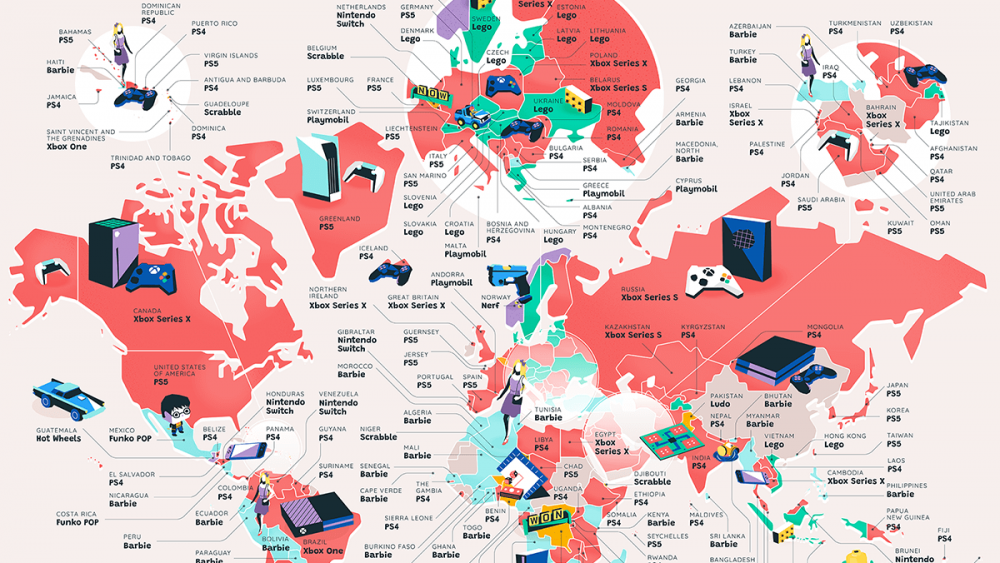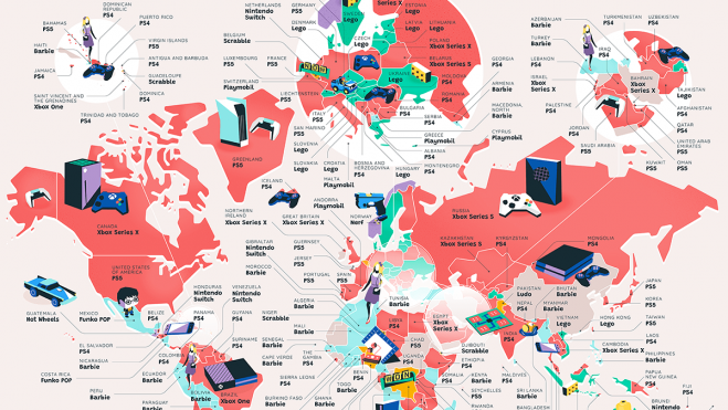 Las consolas, en especial la Play Station 5, se llevan el protagonismo a nivel mundial. En Europa es el juguete más exitoso en España, Portugal, Francia, Luxemburgo, Alemania e Italia. Pero los juegos de mesa y muñecas aún siguen resistiendo en algunos países como en Yibuti y Bélgica, donde  un juego tan veterano como el Scrabble sigue teniendo gran número de seguidores.